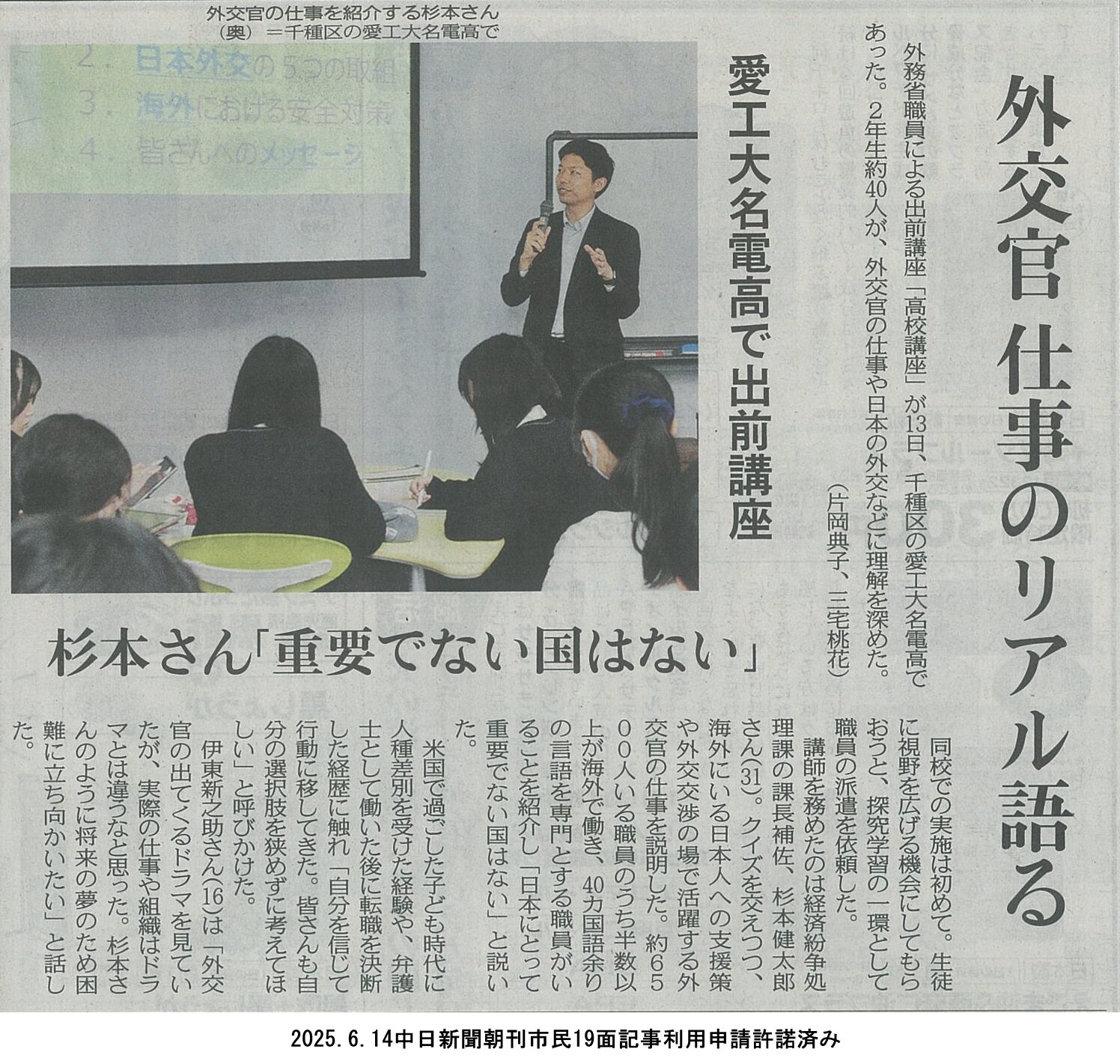新聞に名電高校の取り組みが掲載されました 2025.06.19 高校 2025年6月14日付の中日新聞に名電高校の取り組み掲載されました。 MeidenQuest+(探究学習)外務省「高校講座」の様子 前の画面に戻る